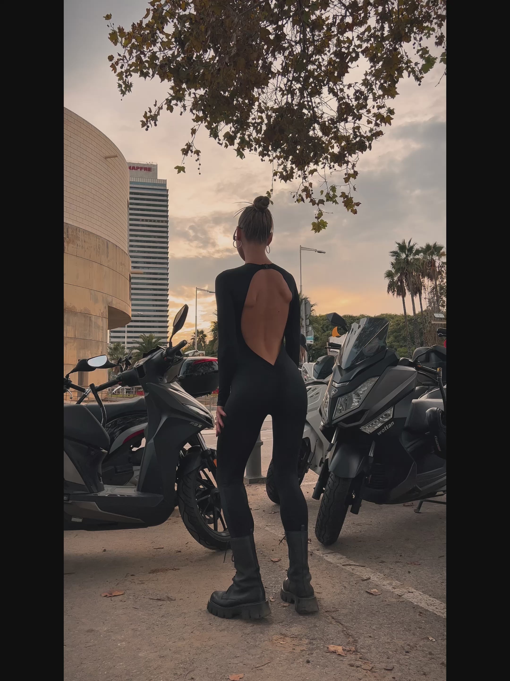 Designed to sculpt your silhouette. Spectacular black jumpsuit, with openings at the front and back, and gathered at the back, creating a push-up effect on your buttocks.
