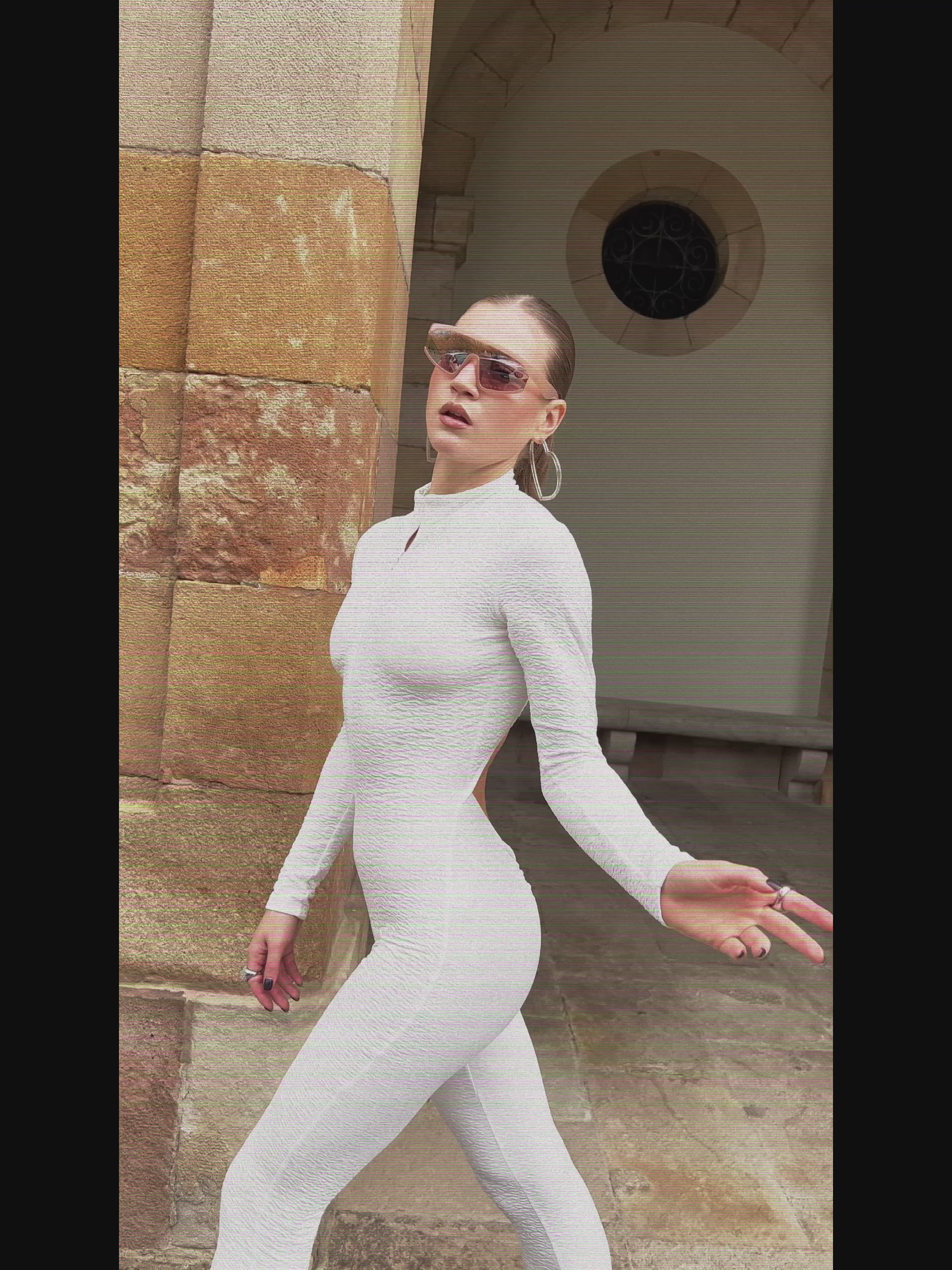White textured jumpsuit with a front zipper in the same color and a fitted cut. Semi-open back with gathered push-up effect. Made with high-quality shaping lycra, which adjusts and outlines the silhouette.