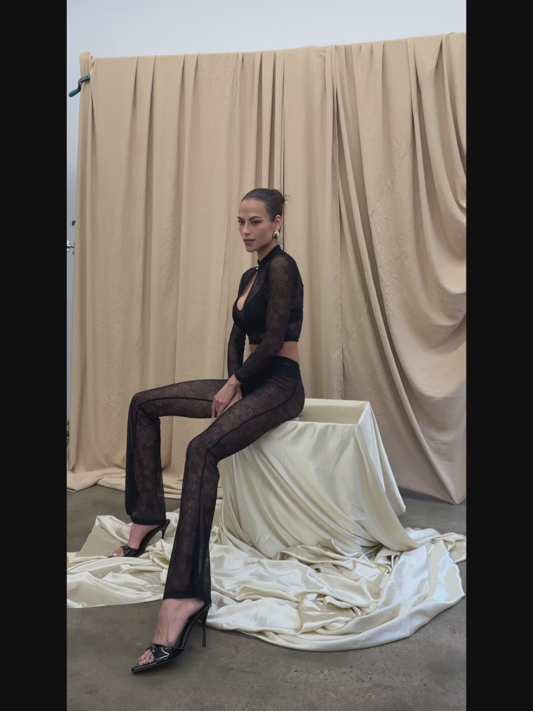 Este conjunto en tono negro con encaje transparente envuelve la figura con un tejido suave, elástico, diseñado para esculpir.