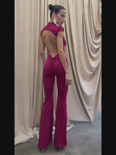 Jumpsuit color burdeos con detalle de puntilla y blonda en el pecho, cuello y mangas, abertura central en el escote, espalda descubierta y fruncido en los glúteos. Este diseño es simplemente espectacular, la pieza que tu armario necesita.